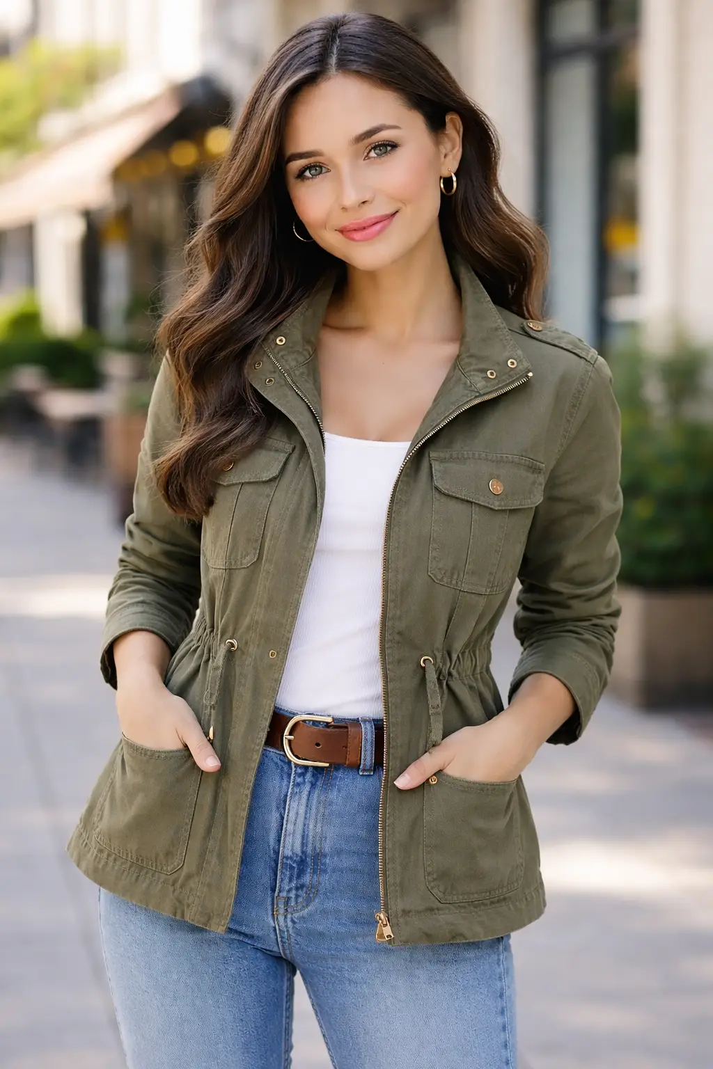 This petite casual utility jacket is designed with a tailored fit that flatters a smaller frame while maintaining an effortlessly relaxed feel. Crafted from a durable yet soft fabric, it features practical details like a stand collar, adjustable waist cinching, and functional patch pockets for everyday ease. The streamlined length and proportioned sleeves ensure a polished look without excess bulk, making it ideal for layering over tees or lightweight knits. Versatile and timeless, this utility jacket transitions seamlessly from casual outings to travel-ready wear, offering both style and function in one essential piece.