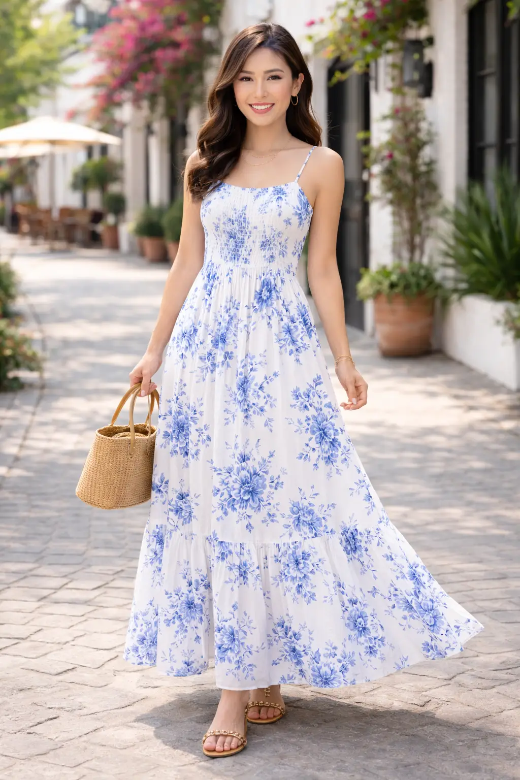 This petite maxi dress is designed to flatter a smaller frame with perfectly balanced proportions and a flowing, ankle-grazing length. The fitted, smocked bodice provides comfortable structure while highlighting the waist, and the lightweight fabric drapes effortlessly into a soft, tiered skirt that moves beautifully with every step. Delicate shoulder straps and a graceful floral print add a feminine, airy feel, making the dress ideal for warm-weather occasions. Thoughtfully tailored for petites, this maxi dress offers elegance and ease without overwhelming the silhouette.